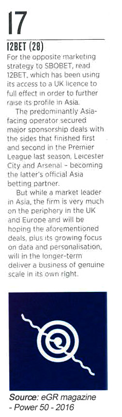 Perusahaan taruhan olahraga dan kasino online terkemuka di Asia, 12BET naik sebelas peringkat pada daftar eGR Power50.